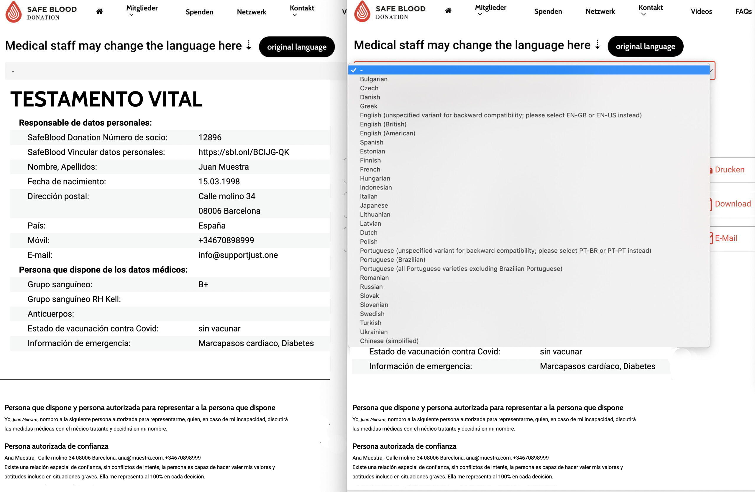 Si deseas tu propia información de emergencia, ve a Iniciar sesión / Login como miembro aquí, donde puedes modificar la plantilla como desees. O puedes hacerte miembro aquí. Entonces, no solo tendrás tu propio testamento vital y tarjeta de miembro/tarjeta de identificación de grupo sanguíneo, sino también un código de emergencia individual.