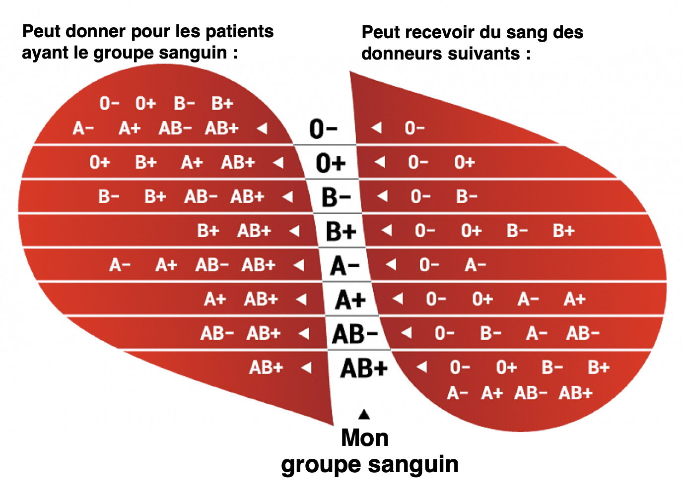 De plus amples informations sur les groupes sanguins de nos membres et sur la compatibilité des groupes sanguins en général sont disponibles à l’adresse suivante : https://safeblood.net/fr/blood-group-diagrams/