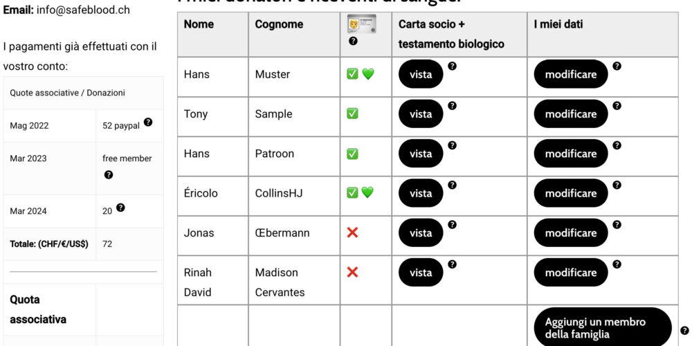 Nessun problema. Naturalmente, è per noi un vantaggio il poter già registrare il vostro gruppo sanguigno in modo da avere una panoramica affidabile dei potenziali donatori e riceventi per gruppo sanguigno. Tuttavia, un numero considerevole dei nostri membri in realtà non conosce il proprio gruppo sanguigno. In questo caso è sufficiente lasciar vuoto il campo corrispondente al momento della registrazione. Se avrete bisogno di sangue in caso di emergenza (o anche in caso di un imminente intervento chirurgico programmato) il gruppo sanguigno sarà comunque determinato come priorità. Lo stesso vale per la donazione del sangue; anche lì viene determinato il gruppo sanguigno, dopodiché riceverete una scheda con tutti i dettagli. Naturalmente, vi consigliamo di far determinare il vostro gruppo sanguigno (la maggior parte dei laboratori medici lo fa), in modo da poterlo specificare quanto prima. Ovviamente potrete aggiornare i vostri dati nel nostro database riservato agli iscritti in qualsiasi momento.