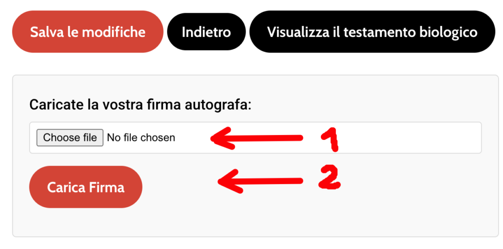 Dopo aver salvato le modifiche, è possibile caricare una firma scansionata. A tal fine, selezionare il file contenente la firma (1, Choose file) e cliccare su “Carica firma (2)”.